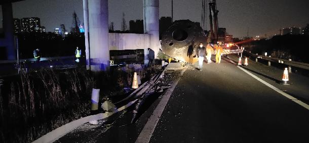 2月25日下午17時17分,寧波繞城高速東路段姜山北互通F匝道墩柱遭到重量為18噸的貨物撞擊,導致一條車道封道,影響正常交通通行。事故起因為后方貨車跟隨前方小車急剎導致貨物掉落,貨物掉落后第一撞擊點為路面,滾動至橋墩停止。