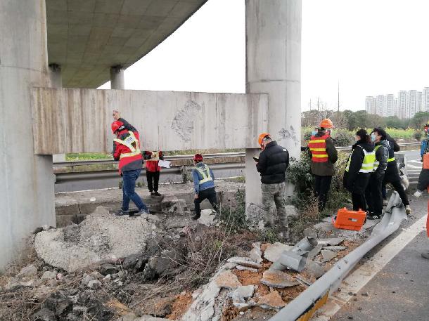 近期我市企事業(yè)單位逐步復工復產,高速車輛逐漸增多,為確保新冠肺炎防疫期間高速公路暢通無阻。事故發(fā)生后,當天晚上18點30分,公司“啄木鳥”青年突擊隊副隊長余恒超、隊員王保磊等組成搶險應急小分隊第一時間到達現場開展檢測工作。經初步檢測,橋墩撞擊處對結構無嚴重影響,路面破損處不影響正常通行,立即建議在鋼護欄破損處設置皮樁,當晚即解除高速封道,恢復正常通行。受夜間光線不足影響,“啄木鳥”青年突擊隊第二天一大早再赴事故現場開展進一步檢測。