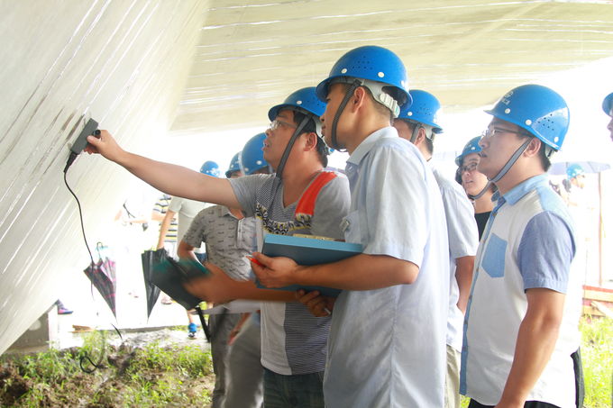 在鋼筋保護層厚度測試現場,檢測部主任助理陳繼盛演示了保護層測厚儀的規(guī)范操作流程。“測得準不準,關鍵一是儀器的靈敏度和精確性,二是準確定位鋼筋的位置,三是要注意人員的操作規(guī)范”陳繼盛如是說。隨后,雙方就橋梁梁板的鋼筋保護層厚度測試進行了技術層面的交流和探討。